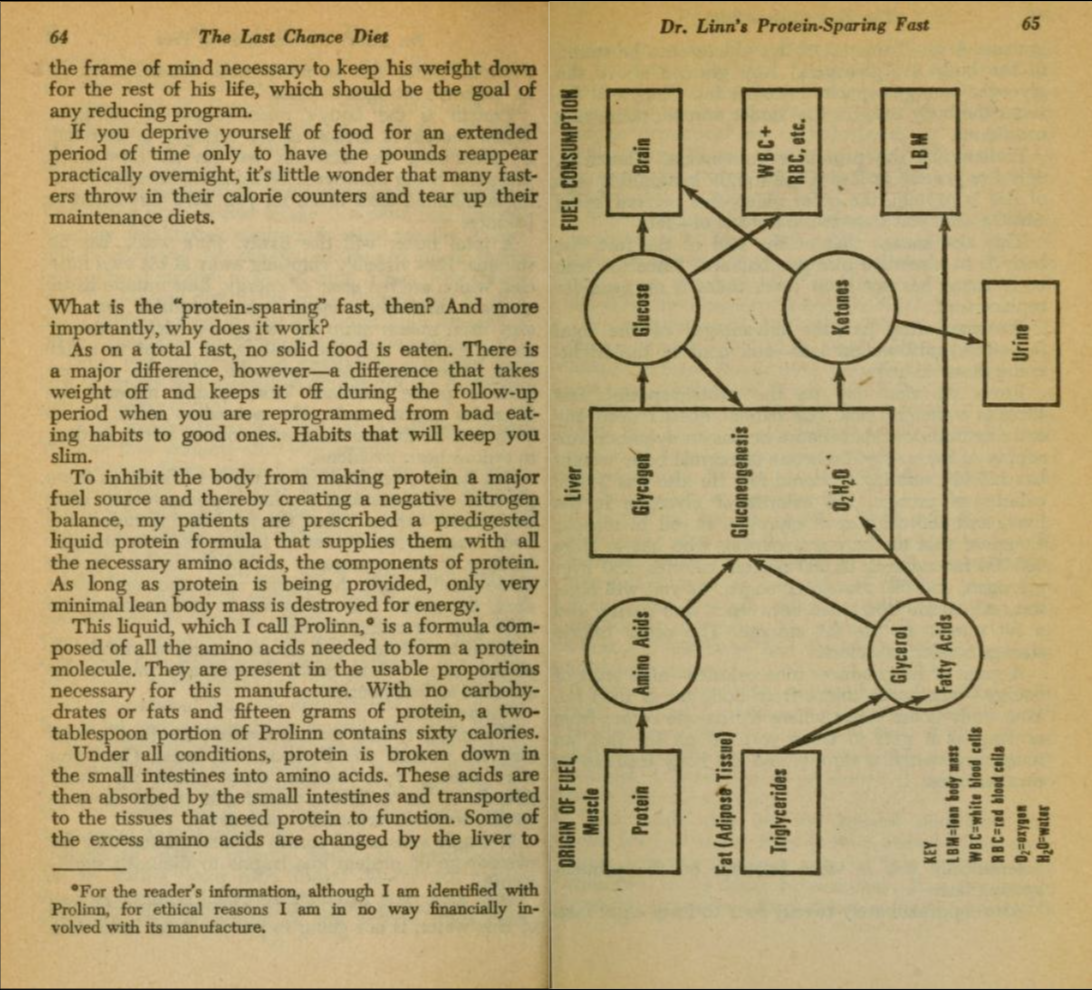 “As long as your body can use ketones and free fatty acids as ‘food,’ significant amounts of protein won’t be destroyed for glucose production,” Linn wrote. “Your body will use the ketones rather than protein because they are a quite more economical energy supply.” To keep the body from using protein, dieters had to subsist on a supplement that Linn said was “composed of all the amino acids needed to form a protein molecule” that are “present in the usable proportions necessary for this manufacture,” and with the supplement, any muscle broken down would be “replaced by the protein from the formula.”
