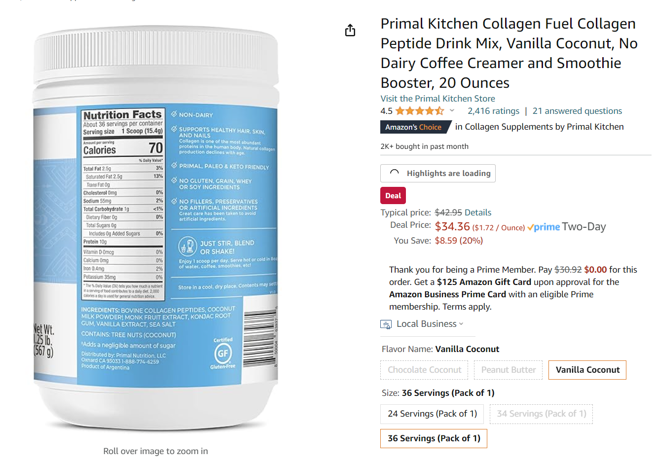 For instance, the label on Primal Kitchen’s Collagen Fuel Collagen Peptide Drink Mix, Vanilla Coconut Flavor says that one serving of collagen is 70 calories and 15.4 grams. The label claims this 15.4 grams contains 10 grams of “protein.” Why doesn’t whoever oversee nutrition labels seem to know or care about this PDCAAS digestibility factor? Why is the label allowed to say a 15-gram scoop of collagen has 10 grams of protein if our bodies won’t even be able to use it effectively?