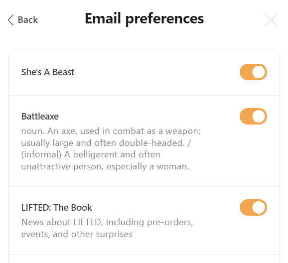 When you are logged in to shesabeast.co, click the Account button in the upper right corner, and then next to Emails, click Manage. Make sure the toggle next to The Book is switched on.