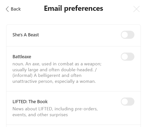 In addition, you may log in to shesabeast.co, click the "Account" button, and in the "Emails" box, click "Manage." At the bottom, click the big button that says "Unsubscribe from all emails." This will, as promised, instantly unsubscribe you from all She's A Beast emails.