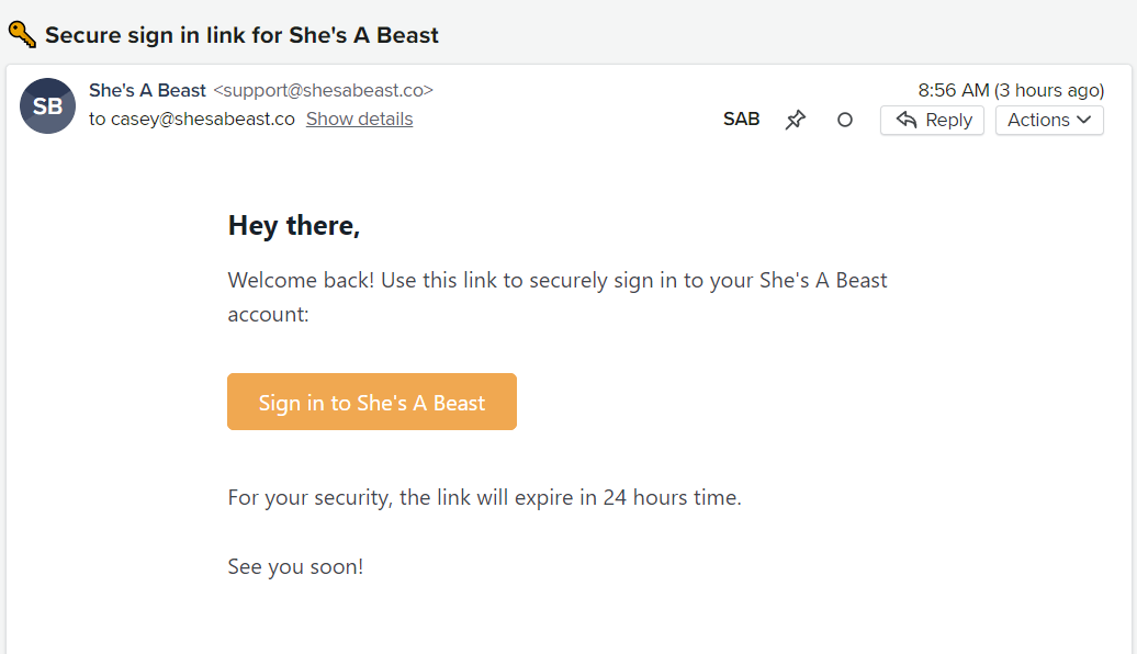 If you attempt to log in but don't receive the magic link within an hour, or you can't remember what email you used to subscribe, please email me at support@shesabeast.co and I will do my best to help you.