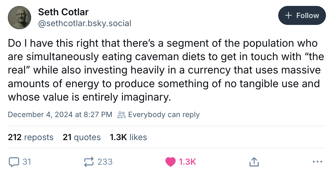All the way into underconsumption. I enjoyed this More Perfect Union video on how shitty clothes are now. My trick for not getting tricked into buying yet another cheap t-shirt is remembering that after one wash, it’ll pill, permanently wrinkle, and the stitching will weirdly shrink while the rest of the garment won’t. Also, check the tag, virtually every piece of clothing now tells you to hand wash and hang dry. Don’t fall for it!!