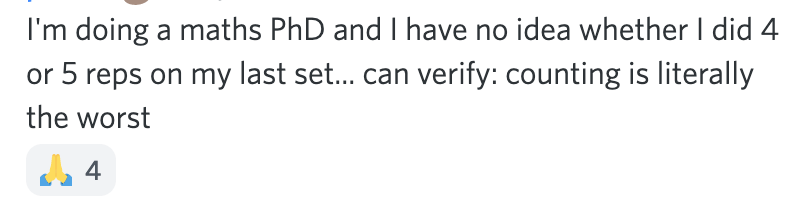 Also, if you’ve ever felt bad about losing count of your reps: let me, a person who has taken graduate-level math, and this person from our Discord reassure you: