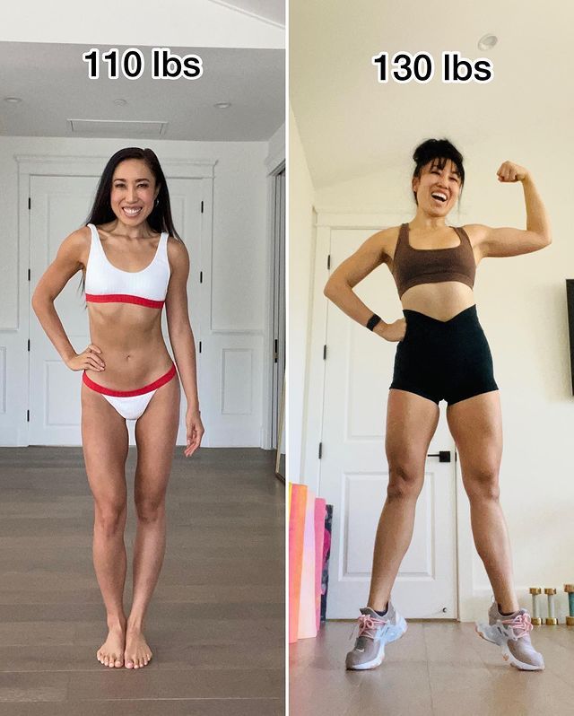 Thins brings us to another Real Fact of the Blogilates 90 day muscle building journey: Particularly for women, body weight and composition almost never moves in a straight line, and it is eminently not worth getting hung up on a few pounds of fluctuations. Her interpretations aside, the ups and downs of the numbers in her chart are so normal as to be mundane. As I said last time, even DEXA scans have a margin of error that would amount to 6-7 pounds up or down for Ho. She is totally right to a) look at the whole long-range arc of what she did and b) strive to go easy on herself. Her 90 days also speaks to how this body composition stuff can be, and should be, phasic: You don’t cut forever, you don’t bulk forever, you don’t recomp forever. Bodies are not fans of it.