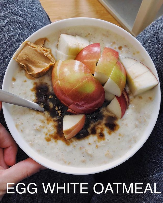 STOVE. Combine oats, alternative milk, egg whites, and salt in a saucepan. Cook over medium-low heat for 5 minutes until oats are cooked through. Add more water/milk if needed. Add the protein powder and stir until incorporated. Top with everything else.