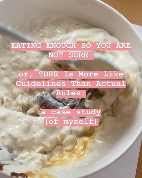 I've written a bunch about the role of "recovery" in soreness generally. Recovery is anything you do outside of the gym that relates to the gym: eating, but also sleeping, managing stress, active recovery like walking or stretching. Recovery is always the first place to look when trying to address soreness. In general, you don't want to default to blaming any particular factor. But that said, I know this newsletter's audience tends to be women, and tends to be people who, like me, have struggled with dieting in the past. So in our collective case, I want to paint with a broad brush and say: if you're sore and miserable, you're probably not eating enough. And if you're SURE, mathematically sure, you are eating "enough," you are probably not eating enough of the things you need.