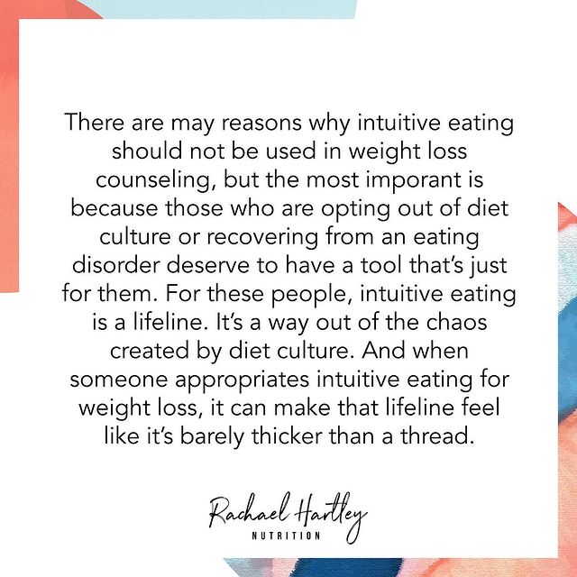 However, given that the intuitive eating journey is technically open-ended and accommodates the “gentle nutrition” bit, it IS actually possible to do both at once; even per the intuitive eating text, structured eating is not bad or disordered or at odds with mental health by default. You just need to have completed most of the intuitive eating process first and be ready for the "gentle nutrition" part. If you're reading all this and still feel a bit lost, an RD or therapist would be a great guide and sounding board for working through what might feel like competing desires.