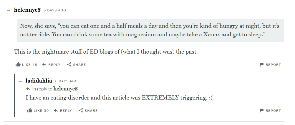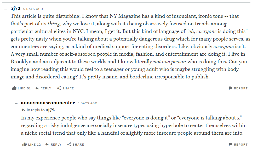 [F2] While I feel "Life After Food Question Mark" very efficiently exemplifies all that can be wrong with diet culture coverage, it’s far from the only breathless “we solved weight loss with a drug!” article; see here, here, here, here, here, and here. This is a more balanced piece. This is an insightful piece.
