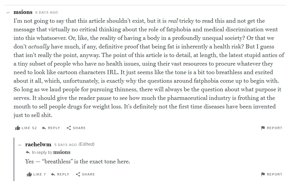 As the article even notes, these drugs don’t work for long-term weight loss unless they are taken indefinitely. That doesn’t stop the piece from trying to have things both ways, humoring its sources by calling the drugs “well-tolerated," only to note as asides the alarming/purposeful side effects (”shitting [one’s] brains out,” nausea, vomiting, headaches). It doesn't challenge any source directly when they long for the day when they can “go off” the drugs, with the fact that oh, by the way, as the article states at the very end, “a recent study funded by the company acknowledged that cessation of semaglutide treatment led study participants to regain most of the weight they had lost within a year.”